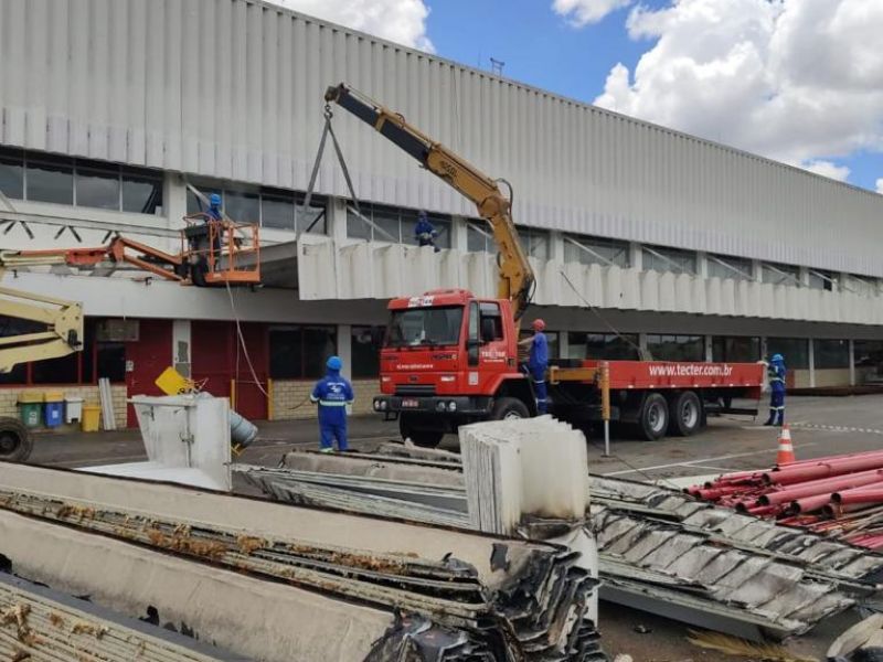 Desmonte convencional de estruturas metálicas, com apoio de mão de obra especializada, plataforma elevatória articulada de longo alcance, ferramentas manuais, guindaste para içamento das peças.