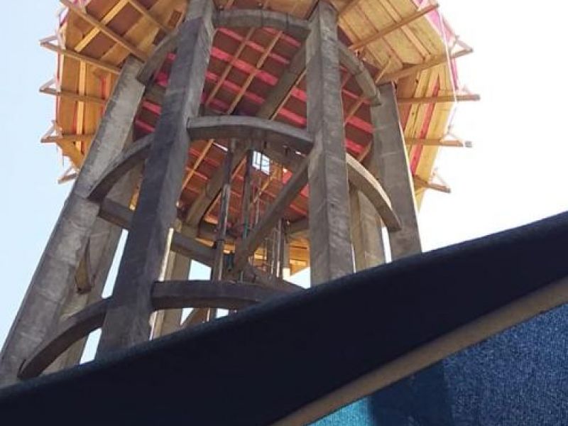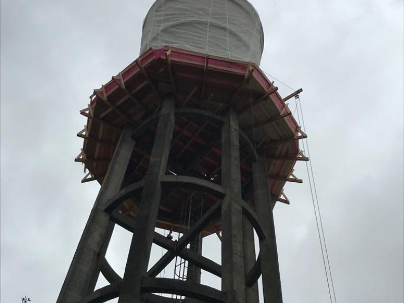 Instalação de bandeija de proteção e tela fachadeira contra queda de fragmentos em caixa de água elevada. Demolição convencional de toda a caixa de agua, incluindo pilares e vigas em concreto armado. Ensacamento do entulho para caçambas estacionarias.