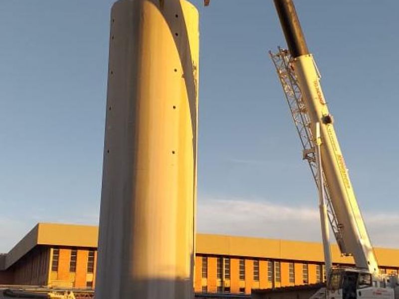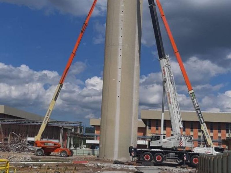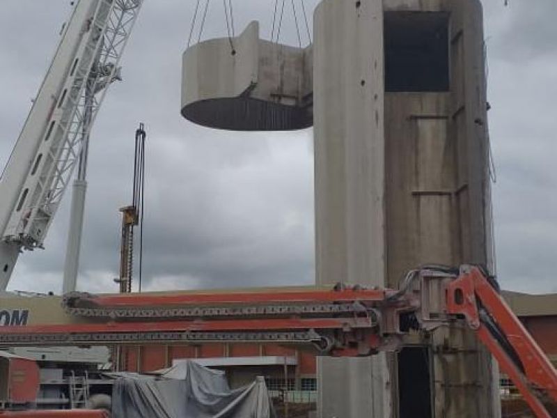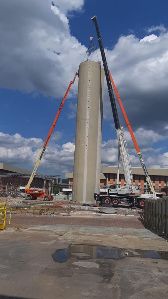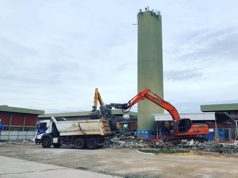 Demolição de caixa de água com corte diamantado, uso de plataforma longo alcance, içamento de placas por guindaste e quebra com pulverizador. Carregamento e transporte de todo o entulho para bota fora legalizado