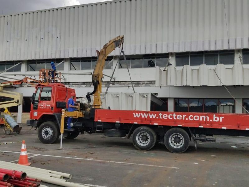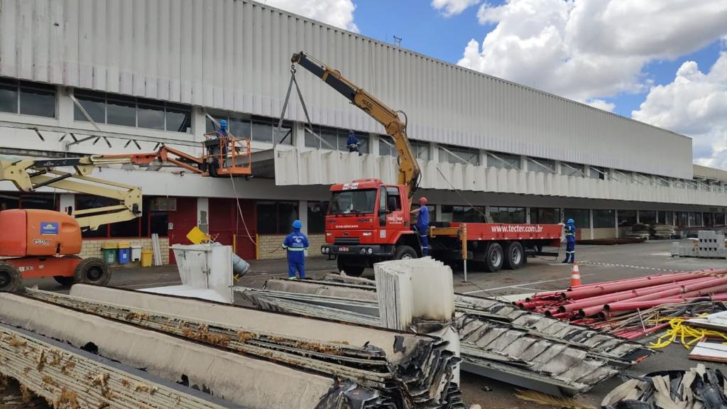 Desmonte convencional de estruturas metálicas, com apoio de mão de obra especializada, plataforma elevatória articulada de longo alcance, ferramentas manuais, guindaste para içamento das peças.