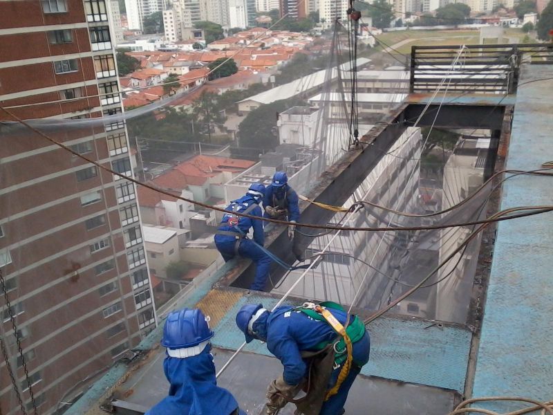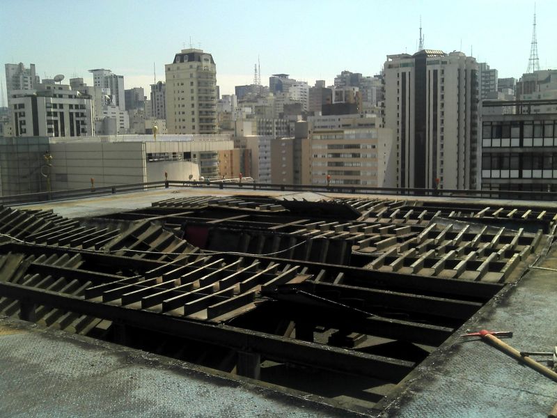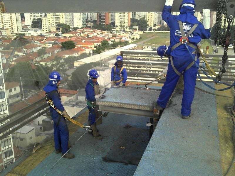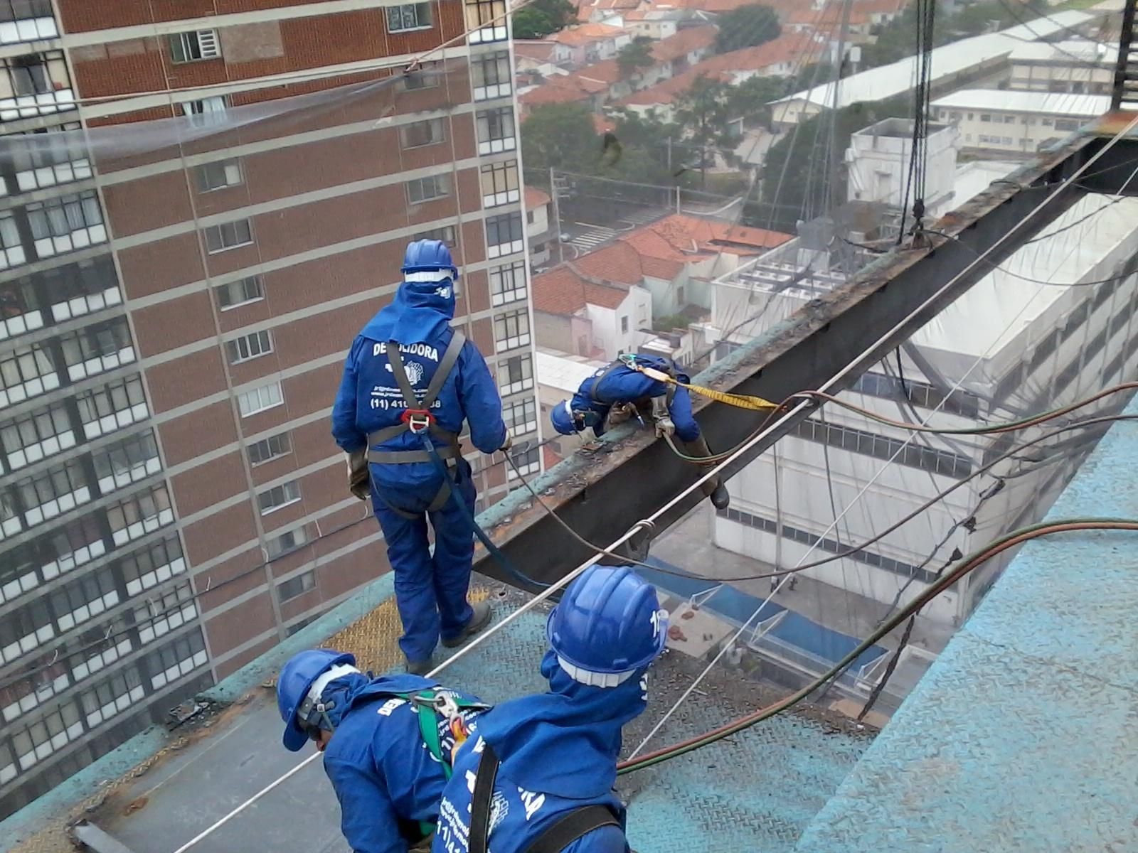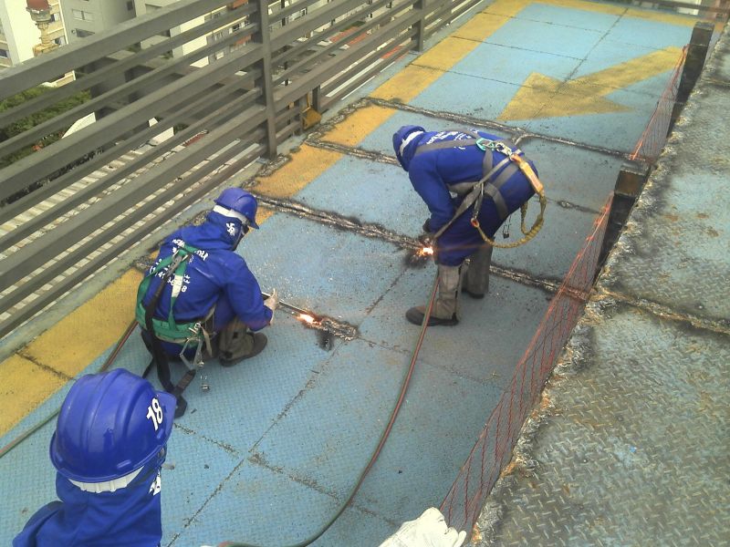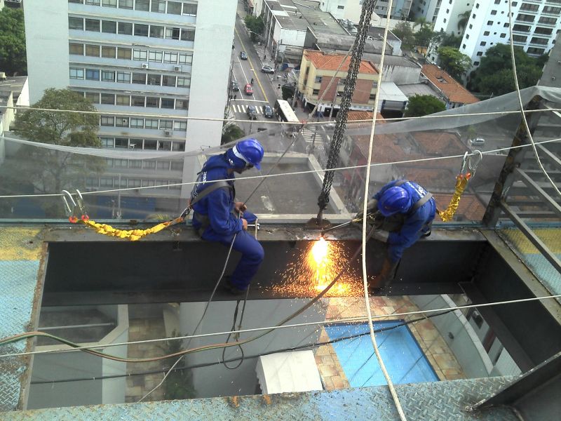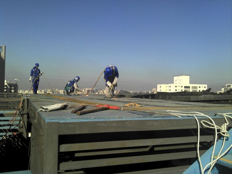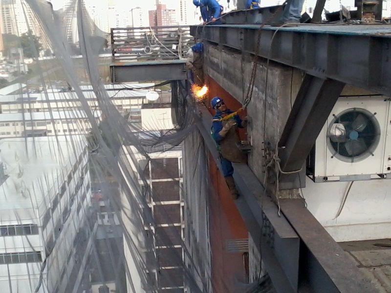 Proteção de tela fachadeira anti chamas. Corte a quente das chapas, vigas e pilares metálicos. Descida das peças peças metálicas cortadas em pedaços pequenos, em altura de 50 mts , deixando toda a parte onde existia um heliponto limpa, com apoio de mão de obra especializada e talha elétrica. Carga e transporte das sucatas ferrosas até a recicladora.